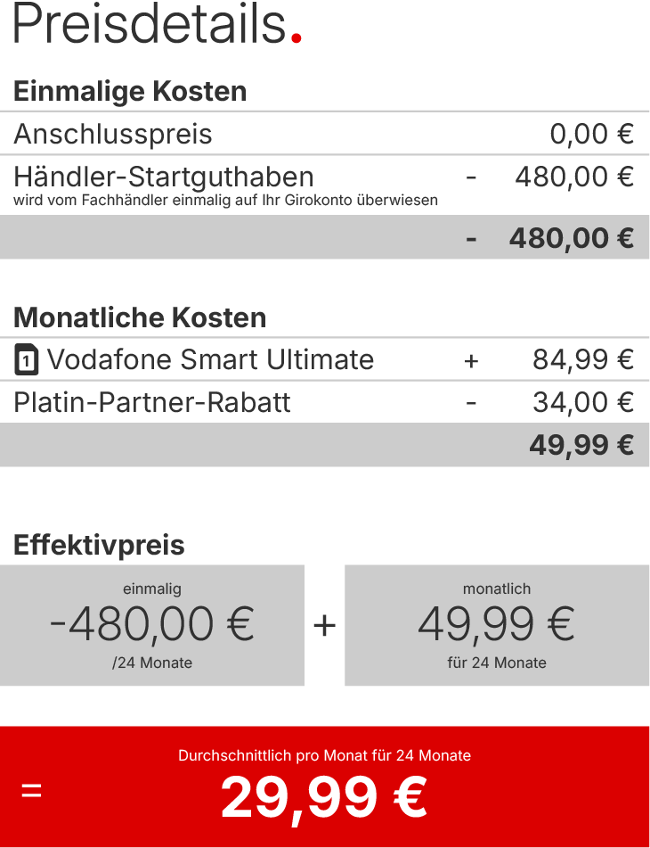 Angebot versteht sich bei Abschluss eines Vodafone Mobilfunkvertrags im Tarif Smart 3 Ultimate mit 35€ Rabatt und einer Laufzeit von 24 Monaten. Der monatliche Paketpreis beträgt, für die ersten 24 Monate 49,99 € pro Monat. Das Startguthaben in Höhe von 480€ erhalten Sie vom Vodafone Mobilfunk Center Hofer, Inhaber Wolfgang Hofer, innerhalb von 8 Wochen nach Vertragsbeginn im Rahmen einer Einmalauszahlung auf Ihr Girokonto gutgeschrieben. Fehlende Gutschriften müssen innerhalb von 6 Wochen nach Ablauf dieser Frist bei uns reklamiert werden; Spätere Reklamationen können nicht akzeptiert werden. Der Anschlusspreis liegt effektiv bei 0,- €, da dieser (39,99€) über die „mein Otelo“ App zurückgefordert werden kann.